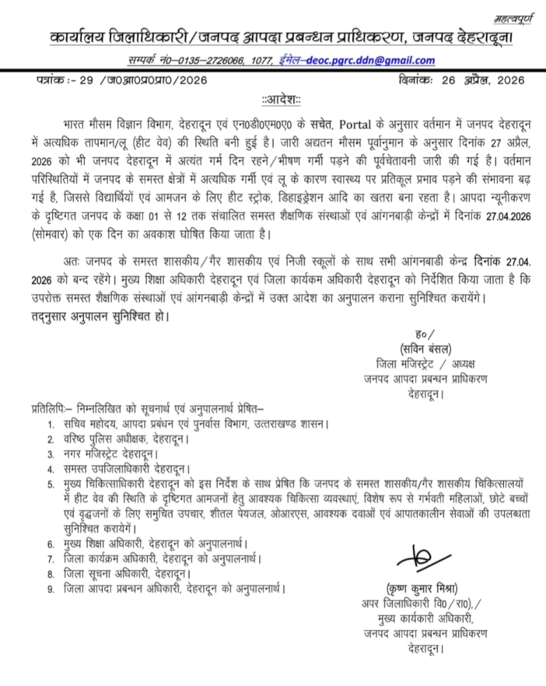 भारत मौसम विज्ञान विभाग, देहरादून एवं एन०डी०एम०ए० के सचेत, Portal के अनुसार वर्तमान में जनपद देहरादून में अत्यधिक तापमान/लू (हीट वेव) की स्थिति बनी हुई है। जारी अद्यतन मौसम पूर्वानुमान के अनुसार दिनांक 27 अप्रैल, 2026 को भी जनपद देहरादून में अत्यंत गर्म दिन रहने/भीषण गर्मी पड़ने की पूर्वचेतावनी जारी की गई है। वर्तमान परिस्थितियों में जनपद के समस्त क्षेत्रों में अत्यधिक गर्मी एवं लू के कारण स्वास्थ्य पर प्रतिकूल प्रभाव पड़ने की संभावना बढ़ गई है, जिससे विद्यार्थियों एवं आमजन के लिए हीट स्ट्रोक, डिहाइड्रेशन आदि का खतरा बना रहता है। आपदा न्यूनीकरण के दृष्टिगत जनपद के कक्षा 01 से 12 तक संचालित समस्त शैक्षणिक संस्थाओं एवं आंगनबाड़ी केन्द्रों में दिनांक 27.04.2026 (सोमवार) को एक दिन का अवकाश घोषित किया जाता है।