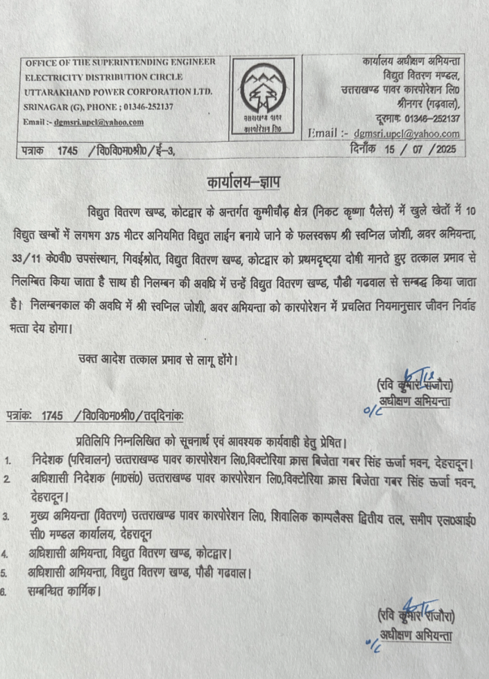 विद्युत वितरण खण्ड, कोटद्वार के अन्तर्गत कुम्भीचौड़ क्षेत्र (निकट कृष्णा पैलेस) में खुले खेतों में 10 विद्युत खम्बों में लगभग 375 मीटर अनियमित विद्युत लाईन बनाये जाने के फलस्वरूप श्री स्वप्निल जोशी, अवर अभियन्ता, 33/11 के०वी० उपसंस्थान, गिवईश्रोत, विद्युत वितरण खण्ड, कोटद्वार को प्रथमदृष्ट्या दोषी मानते हुए तत्काल प्रभाव से निलम्बित किया जाता है साथ ही निलम्बन की अवधि में उन्हें विद्युत वितरण खण्ड, पौडी गढवाल से सम्बद्ध किया जाता है। निलम्बनकाल की अवधि में श्री स्वप्निल जोशी, अवर अभियन्ता को कारपोरेशन में प्रचलित नियमानुसार जीवन निर्वाह भत्ता देय होगा।