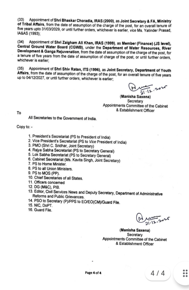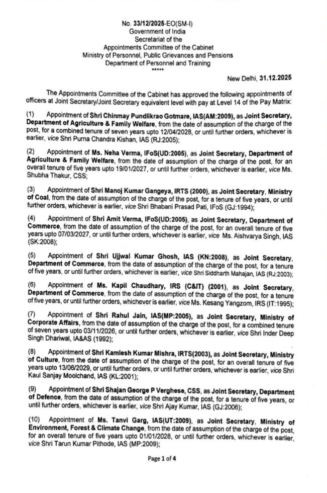 मंत्रिमंडल की नियुक्ति समिति ने संयुक्त सचिव/संयुक्त सचिव के समकक्ष स्तर के 35 अधिकारियों की नियुक्तियों को मंजूरी दे दी है, जिनका वेतनमान वेतन मैट्रिक्स के स्तर 14 के अनुसार होगा:
