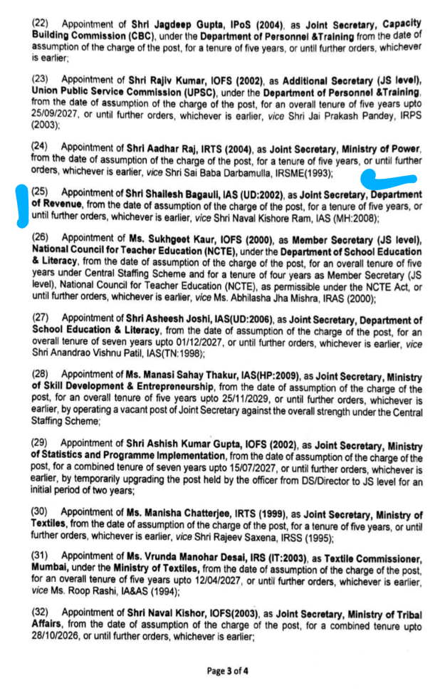 श्री शैलेश बगौली, आईएएस (यूडी:2002) को राजस्व विभाग में संयुक्त सचिव के रूप में पदभार ग्रहण करने की तिथि से पांच वर्ष की अवधि के लिए, या अगले आदेश तक, जो भी पहले हो, श्री नवल किशोर राम, आईएएस (एमएच:2008) के स्थान पर नियुक्त किया जाता है।