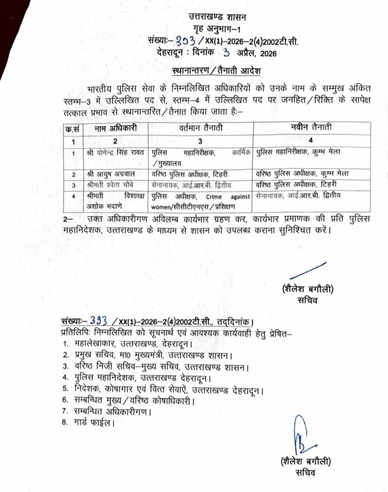 जारी सूची के अनुसार, योगेन्द्र सिंह रावत को पुलिस महानिरीक्षक (कार्मिक/मुख्यालय) से पुलिस महानिरीक्षक, कुंभ मेला नियुक्त किया गया है। वहीं आयुष अग्रवाल को वरिष्ठ पुलिस अधीक्षक, टिहरी से स्थानांतरित कर वरिष्ठ पुलिस अधीक्षक, कुंभ मेला की जिम्मेदारी सौंपी गई है।