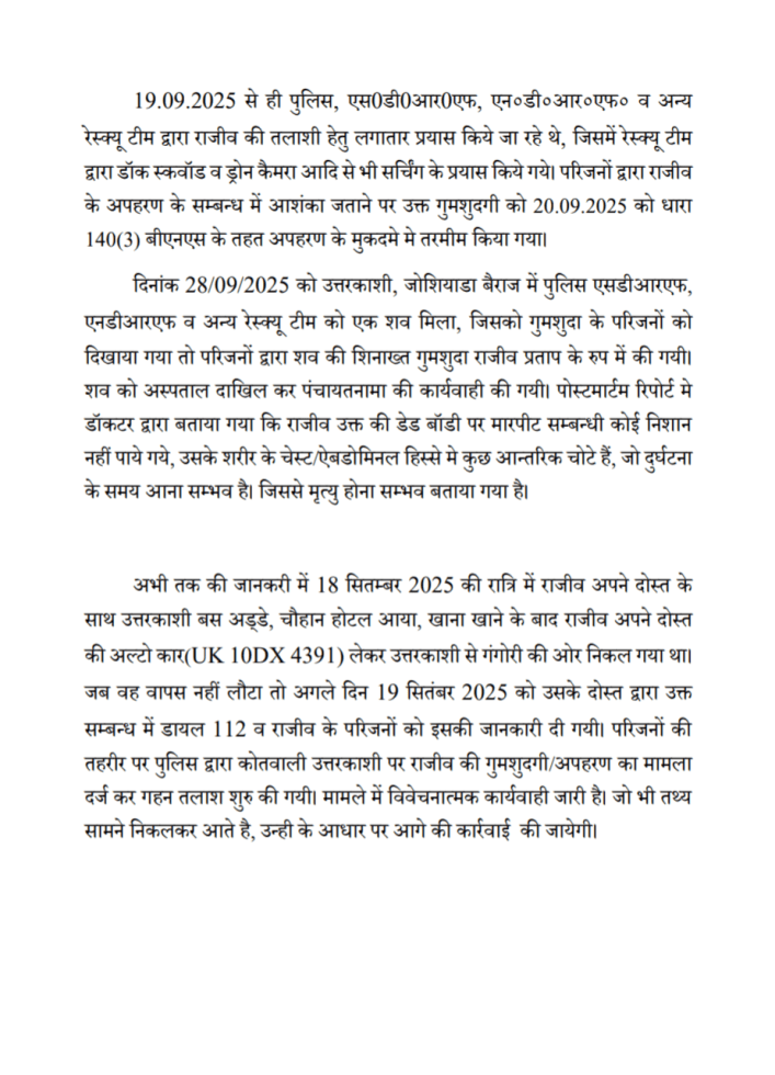 दिनांक 28/09/2025 को उत्तरकाशी, जोशियाडा बैराज में पुलिस एसडीआरएफ, एनडीआरएफ व अन्य रेस्क्यू टीम को एक शव मिला, जिसको गुमशुदा के परिजनों को दिखाया गया तो परिजनों द्वारा शव की शिनाख्त गुमशुदा राजीव प्रताप के रुप में की गयी। शव को अस्पताल दाखिल कर पंचायतनामा की कार्यवाही की गयी। पोस्टमार्टम रिपोर्ट मे डॉकटर द्वारा बताया गया कि राजीव उक्त की डेड बॉडी पर मारपीट सम्बन्धी कोई निशान नहीं पाये गये, उसके शरीर के चेस्ट/ऐबडोमिनल हिस्से मे कुछ आन्तरिक चोटे हैं, जो दुर्घटना के समय आना सम्भव है। जिससे मृत्यु होना सम्भव बताया गया है।
