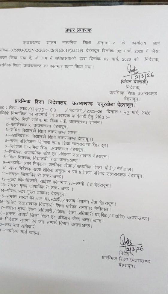 उत्तराखण्ड शासन माध्यमिक शिक्षा अनुभाग-2 के कार्यालय ज्ञाप संख्या-375993/XXIV-2/2026-12(01)/2019 (55529) देहरादून दिनांकः 02 मार्च, 2026 में जैसा व्यक्त किया गया है, के कम में अधोहस्ताक्षरी, द्वारा दिनांकः 02 मार्च, 2026 को निदेशक, परम्भिक शिक्षा, उत्तराखण्ड का कार्यभार ग्रहण किया गया।