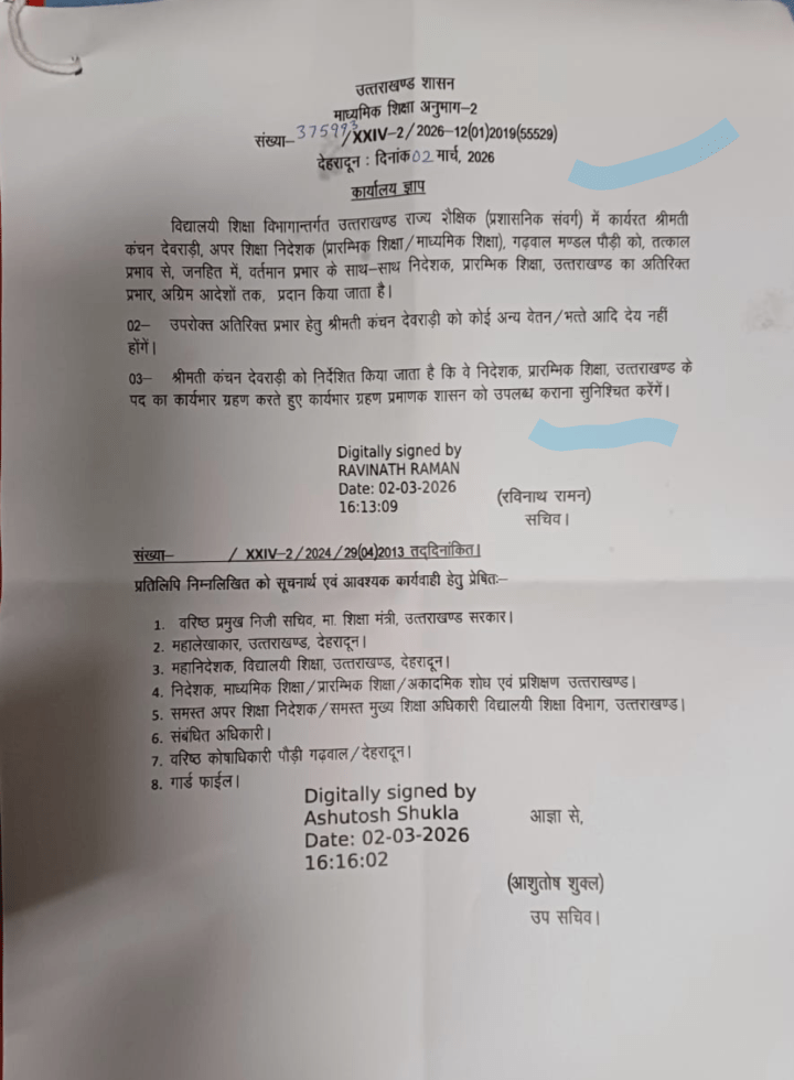 03- श्रीमती कंचन देवराड़ी को निर्देशित किया जाता है कि वे निदेशक, प्रारम्भिक शिक्षा, उत्तराखण्ड के पद का कार्यभार ग्रहण करते हुए कार्यभार ग्रहण प्रमाणक शासन को उपलब्ध कराना सुनिश्चित करेंगें।
