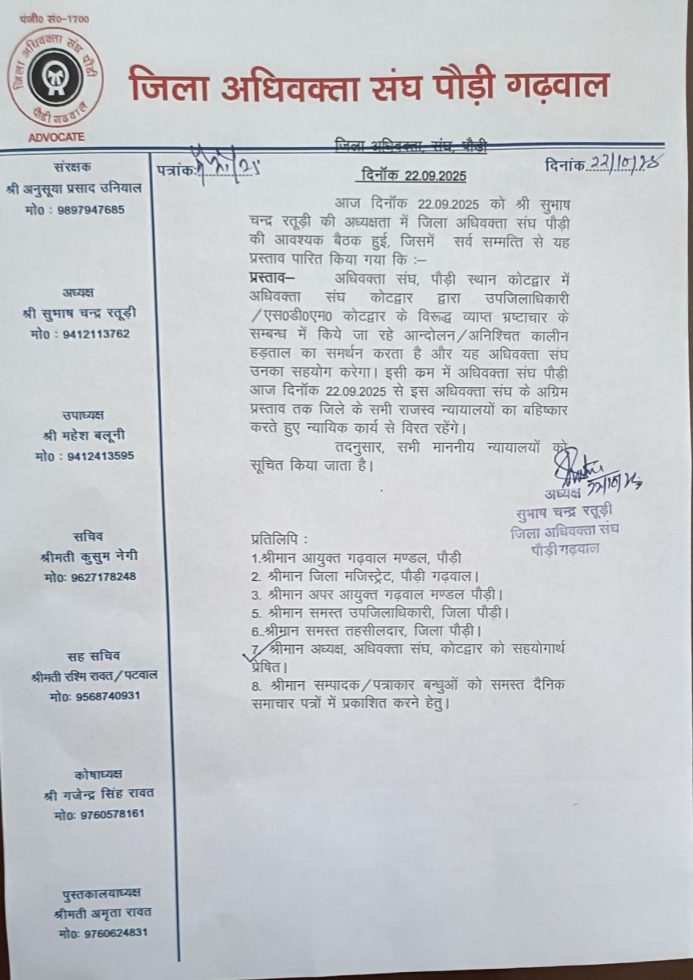 कोटद्वार बार एसोसिएशन ने प्रधानमंत्री,हाईकोर्ट बार एसोसिएशन, मुख्यमंत्री समेत कई मंचों पर पत्र के जरिये अपनी बात पहुंचाई है।