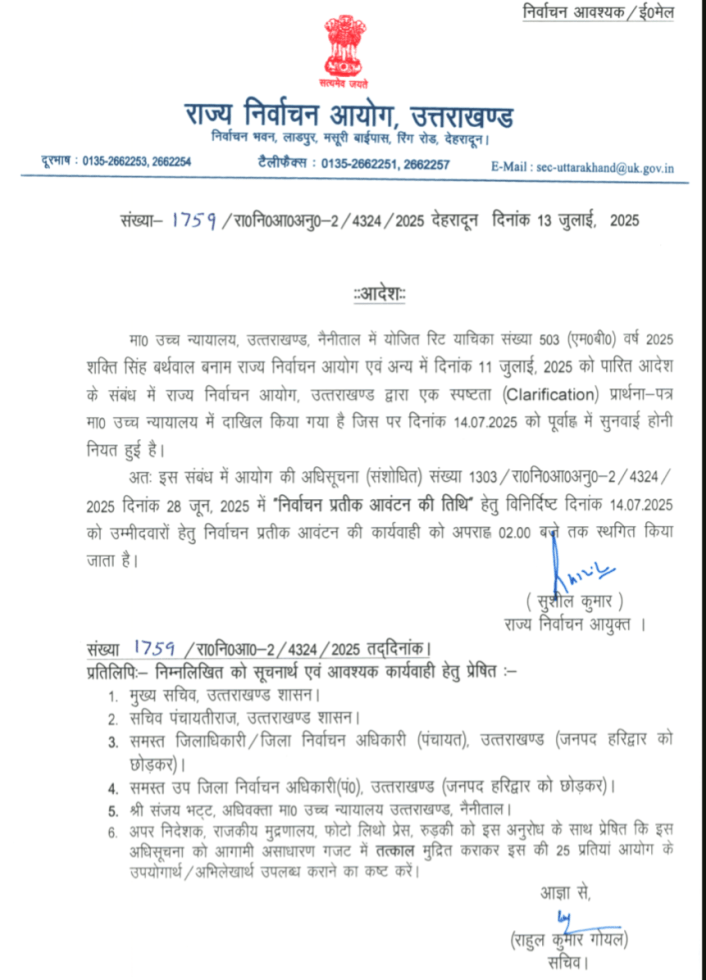 मा० उच्च न्यायालय, उत्तराखण्ड, नैनीताल में योजित रिट याचिका संख्या 503 (एम०बी०) वर्ष 2025 शक्ति सिंह बर्थवाल बनाम राज्य निर्वाचन आयोग एवं अन्य में दिनांक 11 जुलाई, 2025 को पारित आदेश के संबंध में राज्य निर्वाचन आयोग, उत्तराखण्ड द्वारा एक स्पष्टता (Clarification) प्रार्थना-पत्र मा० उच्च न्यायालय में दाखिल किया गया है जिस पर दिनांक 14.07.2025 को पूर्वाह्न में सुनवाई होनी नियत हुई है।