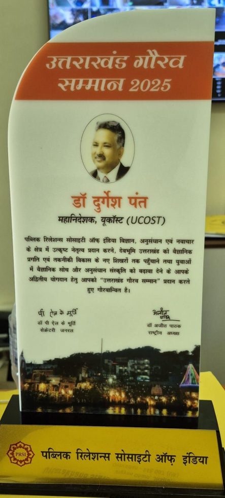 देहरादून। उत्तराखण्ड राज्य विज्ञान एवं प्रौद्योगिकी परिषद के महानिदेशक प्रोफेसर दुर्गेश पंत को पब्लिक रिलेशन सोसाइटी ऑफ इण्डिया ने “उत्तराखण्ड गौरव सम्मान-2025” से गौरवान्वित किया।