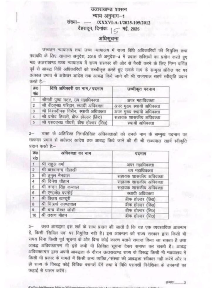 उच्चतम न्यायालय तथा उच्च न्यायालय में राज्य विधि अधिकारियों की नियुक्ति तथा पदावधि के लिए सामान्य अनुदेश, 2016 के अनुदेश-4 में प्रदत्त शक्तियों का प्रयोग करते हुए मा० उत्तराखण्ड उच्च न्यायालय में राज्य सरकार की ओर से पैरवी करने के लिए निम्न वर्णित पूर्व से आबद्ध विधि अधिकारियों को उच्चीकृत करते हुए उनके नाम के सम्मुख अंकित पद पर तत्काल प्रभाव से अग्रेत्तर आदेश तक आबद्ध किये जाने की श्री राज्यपाल सहर्ष स्वीकृति प्रदान करते है:-