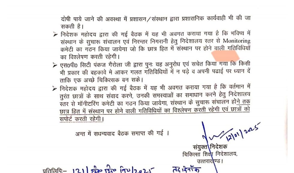 निदेशक महोदय द्वारा की गई बैठक में यह भी अवगत कराया गया है कि वर्तमान में तुरंत छात्रों के साथ संवाद करने, उनकी समस्याओं का समाधान करने हेतु निदेशालय स्तर से मॉनीटरिंग कमेटी का गठन किया जायेगा। संस्थान के सुचारू संचालन होने तक छात्र हित में संस्थान पर होने वाली गतिविधियों का विश्लेषण करती रहेगी एवं छात्रों को सपोर्ट करती रहेगी।