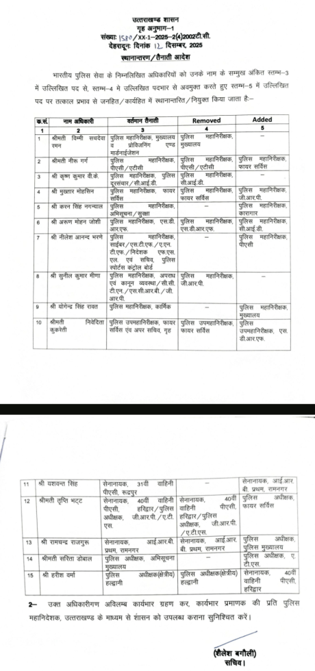 निवेदिता कुकरेती को पुलिस उपमहानिरीक्षक, SDRF की जिम्मेदारी दी गयी है।