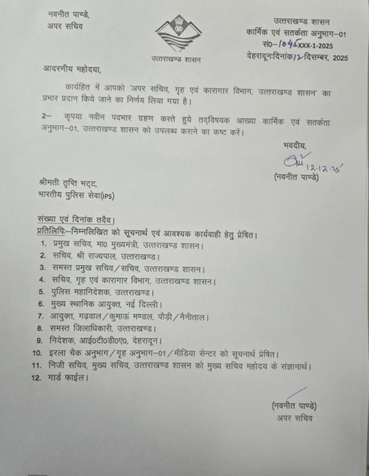 आईपीएस तृप्ति भट्ट को गृह एवं कारागार विभाग में अपर सचिव बनाया गया है।