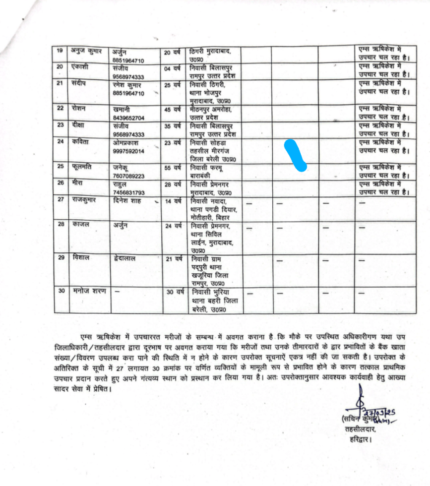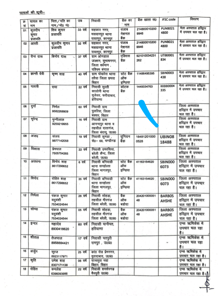 सचिव आपदा प्रबंधन विनोद कुमार सुमन ने घटना की जानकारी देते हुए बताया कि इस दुर्घटना में 05 गंभीर रूप से घायल श्रद्धालुओं को बेहतर चिकित्सा सुविधा के लिए एम्स ऋषिकेश रेफर किया गया है। इसके अतिरिक्त 23 अन्य घायल श्रद्धालुओं का उपचार जिला चिकित्सालय हरिद्वार में चल रहा है, जहां सभी घायलों को आवश्यक चिकित्सकीय सहायता उपलब्ध कराई जा रही है।