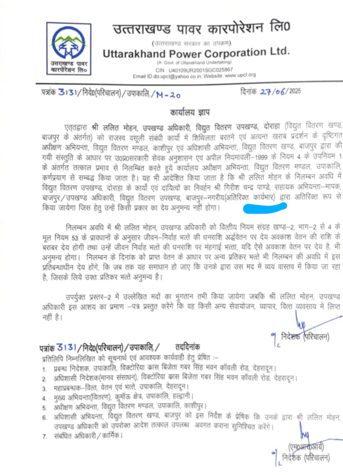 काशीपुर। बिजली विभाग के दोराहा उपखण्ड (बाजपुर) में पदस्थ उपखण्ड अधिकारी ललित मोहन को राजस्व वसूली संबंधी कार्यों में लापरवाही और अत्यंत खराब प्रदर्शन के कारण तत्काल प्रभाव से निलंबित कर दिया गया है। यह कार्रवाई अधीक्षण अभियन्ता, विद्युत वितरण मण्डल, काशीपुर तथा अधिशासी अभियन्ता, विद्युत वितरण खण्ड, बाजपुर की संस्तुति पर की गई है।