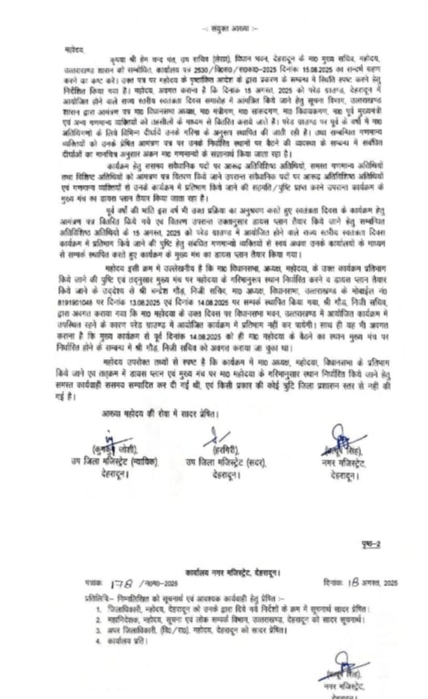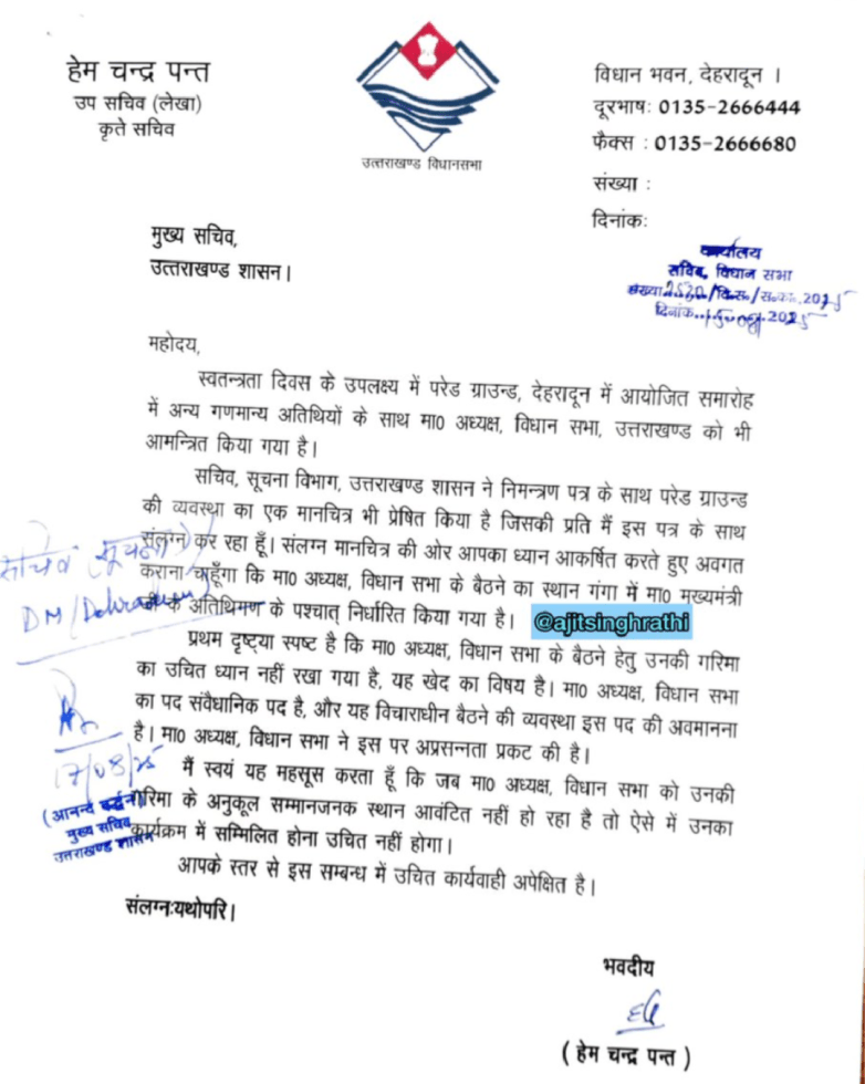 कृपया श्री हेम बन्द पंत, उप सचिव (लेखा), विधान भन्न, देहरादून के माठ मुख्य सचिव, महोदय, उत्तराखण्ड शारान को सम्बोधित कार्यालय पत्र 2530/वि०स०/रा०००-2025 दिनांक 15.08.2025 का सन्दर्भ ग्रहण करने का कष्ट करें। उक्त पत्र पर महोदय के पृष्ठांकित आदेश के द्वारा प्रकरण के सम्बन्ध में स्थिति स्पष्ट करने हेतु निर्देशित किया गया है। महोदय, अवगत कराना है कि दिनांक 15 अगस्त 2025 को परेड ग्राउण्ड, देहरादून में आयोजित होने वाले राज्य स्तरीय स्वतंत्रता दिवस समारोह में आंगत्रित किये जाने हेतु सूचना विभाग, उत्तराखण्ड शासन द्वारा आमंत्रण पत्र गाठ विधानसभा अध्यक्ष मा० मंत्रीगण, म० सांसदगण, मा० विधायकगण न० पूर्व मुख्यमंत्री एवं अन्य गणमान्य व्यक्तियों से वहसीलों के माध्यम से कितरित कराये जाते है। परेड ग्राउण्ड पर पूर्व के वर्षों में ना० अतिथिगणों के लिये विभिन्न दीर्धाचे उनके गरिया के अनुरूप स्थापित की जाती रही है। तथा सम्बन्धित गणमान्य व्यक्तियों को उनके प्रेषित आमंत्रण पत्र पर उनके निर्धारित स्थानों पर बैठने की व्यवस्था के सम्बन्ध में संबंधित दीर्घाओं का गानचित्र अनुसार अंकन मा० गणनान्यों के संज्ञानार्थ किया जाता रहा है।