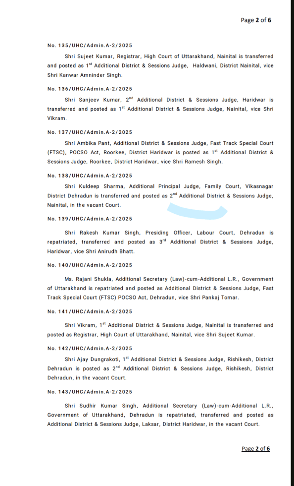 Shri Sujeet Kumar, Registrar, High Court of Uttarakhand, Nainital is transferred and posted as 1st Additional District & Sessions Judge, Haldwani, District Nainital, vice Shri Kanwar Amninder Singh.