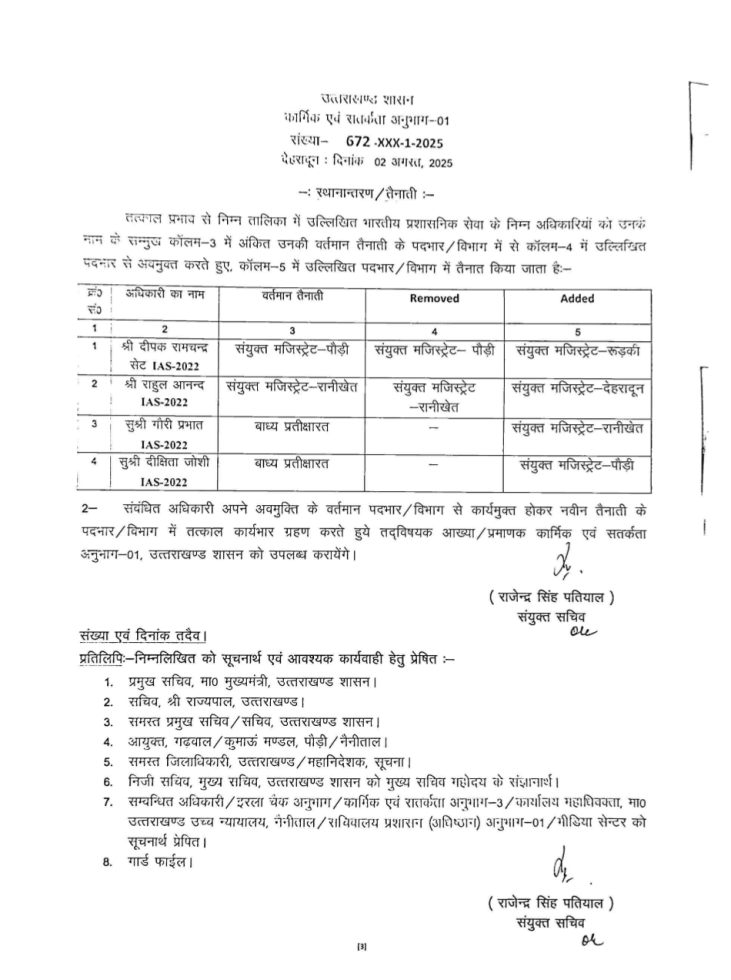 2022 बैच के आईएएस दीक्षिता जोशी को पौड़ी का संयुक्त मजिस्ट्रेट बनाया गया है। आईएएस दीपक रामचंद्र, राहुल आनन्द व गौरी प्रभात को क्रमशः रुड़की, देहरादून व रानीखेत में संयुक्त मजिस्ट्रेट बनाया गया है।