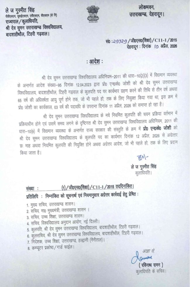 राज्यपाल/कुलाधिपति ले.ज. गुरमीत सिंह द्वारा जारी आदेश के अनुसार, विश्वविद्यालय अधिनियम-2011 की धारा 10(2)(3) के तहत नियुक्त प्रो. एन.के. जोशी का तीन वर्षीय कार्यकाल 11 अप्रैल 2026 को समाप्त हो रहा है। इसके उपरांत उन्हें 12 अप्रैल 2026 से अग्रेतर आदेश तक या अधिकतम छह माह की अवधि तक कुलपति पद का कार्यभार संभालने की अनुमति प्रदान की गई है।