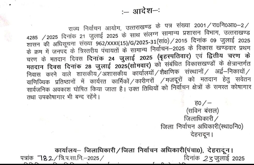 राज्य निर्वाचन आयोग, उत्तराखण्ड के पत्र संख्या 2001 / रा०नि०आ०-2/4285 / 2025 दिनांक 21 जुलाई 2025 के साथ संलग्न सामान्य प्रशासन विभाग, उत्तराखण्ड शासन की अधिसूचना संख्या 962/XXXI (15)/G/2025-31 (सां0) / 2015 दिनांक 09 जुलाई 2025 के क्रम में जनपद के त्रिस्तरीय पंचायतों के सामान्य निर्वाचन-2025 के विकास खण्डवार प्रथम चरण के मतदान दिवस दिनांक 24 जुलाई 2025 (बृहस्पतिवार) एवं द्वितीय चरण के मतदान दिवस दिनांक 28 जुलाई 2025 (सोमवार) को संबंधित विकासखण्डों के क्षेत्रान्तर्गत निवास करने वाले शासकीय/अशासकीय कार्यालयों / शैक्षणिक संस्थानों / अर्द्ध-निकायों /वाणिज्यिक प्रतिष्ठानों में कार्यरत कार्मिकों / कारीगरों / मजदूरों को मतदान हेतु सवेतन सार्वजनिक अवकाश घोषित किया जाता है। उक्त तिथियों को निर्वाचन क्षेत्रों के समस्त कोषागार तथा उपकोषागार भी बन्द रहेंगे।