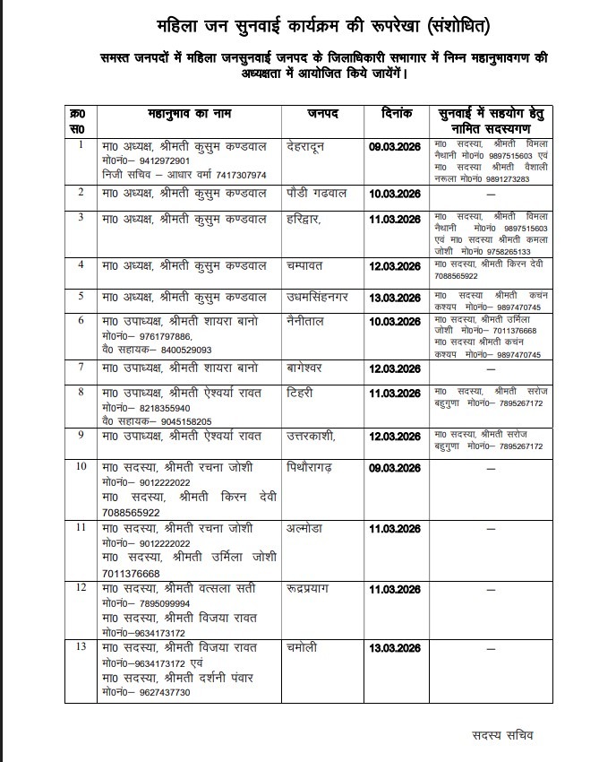 अंत में अध्यक्ष कुसुम कंडवाल ने प्रदेश की समस्त महिलाओं से अपील की है कि वे निर्धारित तिथियों पर आयोजित होने वाली इन जनसुनवाई में निर्भीक होकर प्रतिभाग करें और अपनी समस्याओं व लंबित प्रकरणों को आयोग के समक्ष रखें।