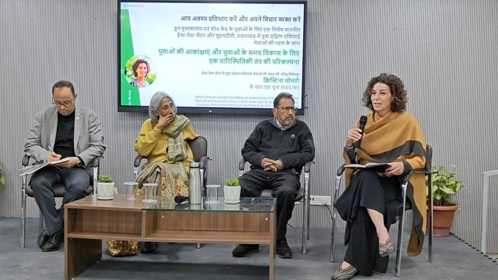 देहरादून। दून पुस्तकालय एवं शोध केंद्र की और से आज प्रातः युवाओं की आकांक्षाएं और युवाओं के समग्र विकास के लिए एक पारिस्थितिकी तंत्र की परिकल्पना विषय पर एक युवा संवाद सत्र का आयोजन किया गया. इस सत्र में ईस्ट-वेस्ट सेंटर में युवा दक्षिण एशियाई नेताओं की पहल की वरिष्ठ विशेषज्ञ क्रिस्टिना मोनरो ने पुस्तकालय के युवा पाठकों के साथ विविध मुद्दों पर सार्थक संवाद किया. कार्यक्रम सत्र की अध्यक्षता दून पुस्तकालय एवं शोध केंद्र के संस्थापक-अध्यक्ष व सामाजिक विज्ञानी प्रोफे. बी.के. जोशी ने की. इस अवसर पर पूर्व प्रमुख सचिव, उत्तराखंड शासन विभापुरी दास भी उपस्थित रहीं.